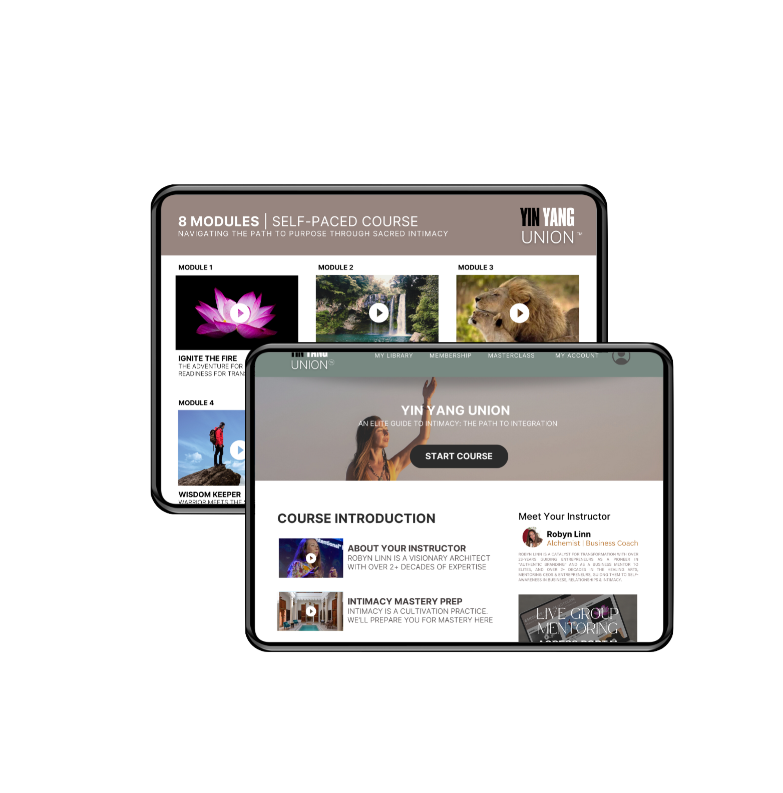 Unlock the Secrets of Sacred Intimacy: Transform Yourself and Your Relationships.This program is a signature offering that's designed for both men and women who seek to cultivate a deeper activation of power and receptivity.With practical techniques and tools for fulfilling partnerships— Yin Yang Union invites you into a mastery of intimacy where you become a master of being you with lovers, partners and in your purposeful business.By bridging the gap between yin and yang energies, you'll embark upon a journey of self-awareness and transformation, leading to profound connections and exquisite relationships.Drawing from ancient wisdom with Master-taught curated practices, you'll learn how to harness your energy of extremes. It's time to stop accepting bad behaviour from your partner; or attracting bad lovers.If you want to build a real relationship, Yin Yang Union is for you.With a culmination of 2-decades of deep integrative training and teaching, Robyn Linn de-clutters the mystery of cultivating intimacy, so you cultivate a REAL relationship.If we're not in touch with how our energy dynamics work, we aren't tapped into our power and sensual potency.In this Program— you will not only receive these techniques, but become a master. Let's begin.
